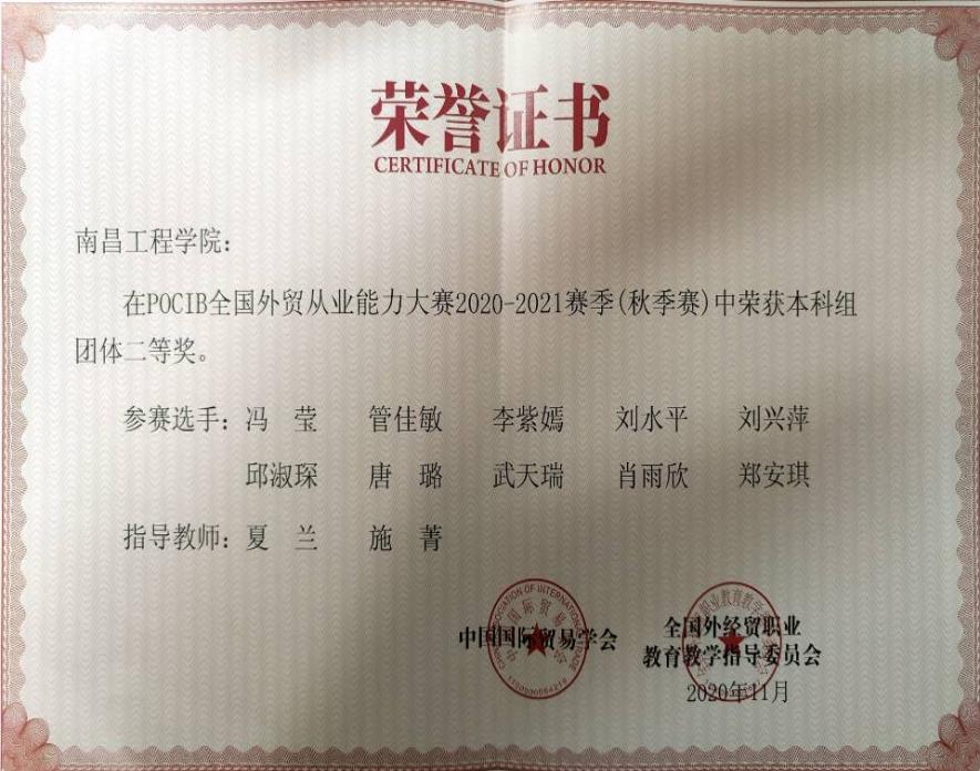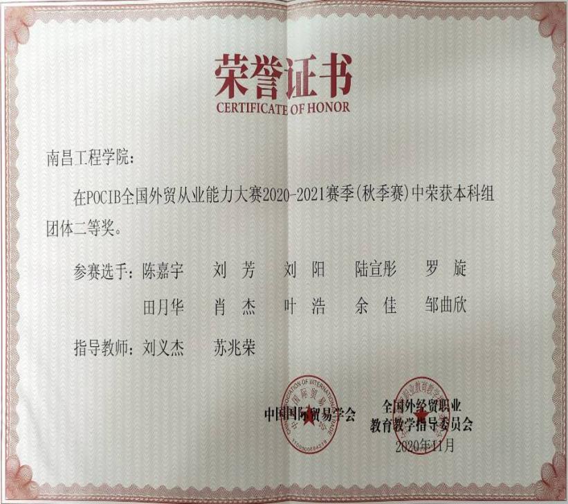 为进一步推动学生职业能力的培养与锻炼,提升学生职业能力的水平,由我院国际经济与贸易专业学生组成的三支参赛队在国贸教研室的全体老师认真指导下,于2020年10月20日-11月3日参加了第十届POCIB全国外贸从业能力大赛。近日,赛事组委会揭晓了比赛成绩,我院三支队伍全部取得优异成绩,荣获团体二等奖2项,团体三等奖1项。据悉,本届大赛共有116所本科院校287支队伍参赛。本项赛事是由中国国际贸易学会、全国外经贸职业教育教学指导委员会主办。(文/图:刘义杰)