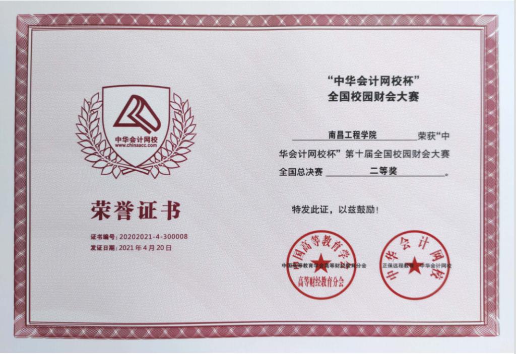 2021年4月16日中国高等教育学会高等财经教育分会指导,正保远程教育、中华会计网校主办的“中华会计网校杯”第十届全国校园财会大赛顺利举行,我校参赛的陈锦焱、吴昊霖和江沁怡三位同学在管静老师的悉心指导下,沉着冷静、力争上游以总分275.9的优异成绩取得第8名,斩获全国总决赛二等奖。
