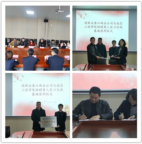 2月28日下午,经济贸易学院与国新证券江西分公司共建实践教学基地签约暨授牌仪式在济民楼B406会议室举行。学院党委书记王键、院长万义平、国新证券江西分公司代表和金融教研室全体老师参加了签约仪式,签约仪式由副院长郑智主持。