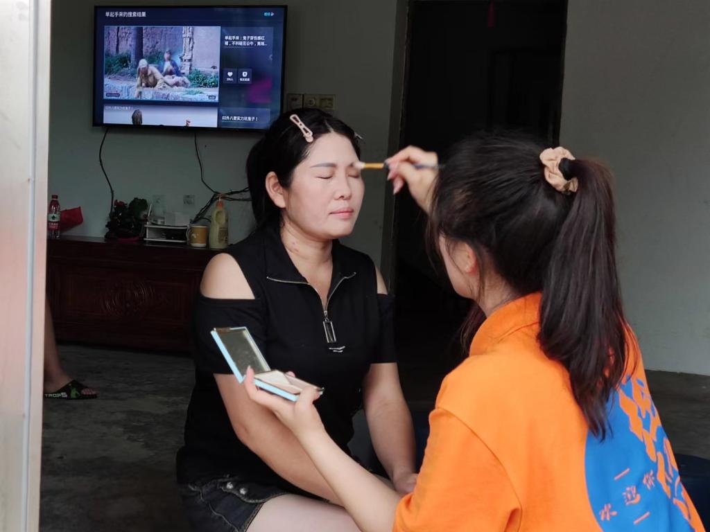 爱出者爱返,福往者福来。志愿者们深入当地街道村巷为村民化妆,拍摄过程中耐心提醒村民往前走一点、头抬高一点,笑容灿烂一点……,然后轻触快门,一张张灿烂的笑脸被定格,一个个温馨幸福的瞬间被记录。村民王阿姨说:“我从来没有拍过照,也不知道怎么摆姿势,谢谢你们让我体验了一次新事物”。一张张照片是爱与温暖的传递,是瞬息万变的人间。志愿者用自己的热情与真诚温暖了当地村民,积极倡导村民将爱和温暖传递,推动形成相亲相爱、向上向善的社会主义乡村文明新风尚。