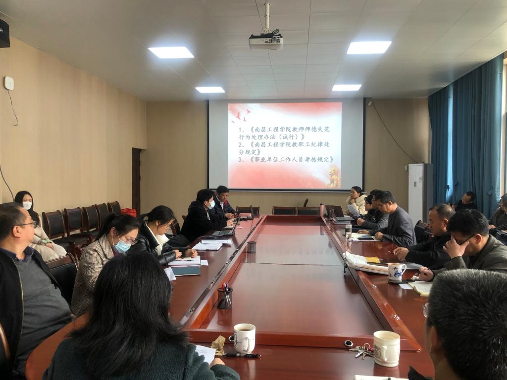 3月28日下午,经济贸易学院组织全院教职工在学院会议室,学习了学校下发的三个重要文件:《南昌工程学院教师师德失范行为处理办法(试行)》、《南昌工程学院教职工纪律处分规定》、《事业单位工作人员考核规定》。