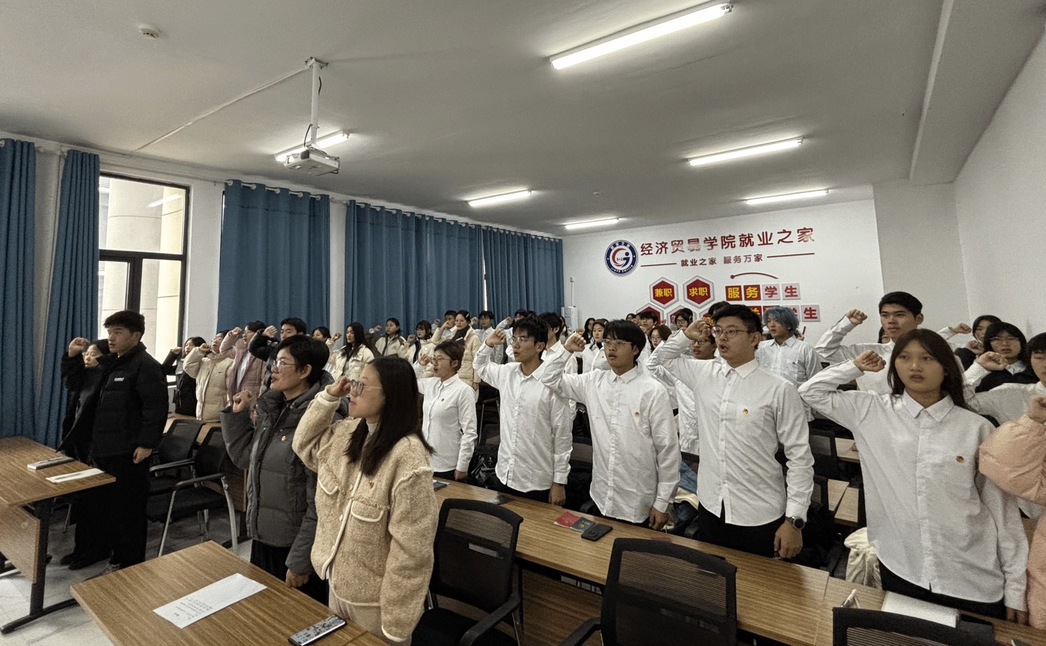 1月5日,经济贸易学院与理学院在济民楼B206联合举行2025年下半年新团员入团仪式。经济贸易学院团委书记臧秀娟、理学院团委书记揭蕾出席仪式,新发展团员、老团员代表共同参与,见证这一庄严神圣的时刻。