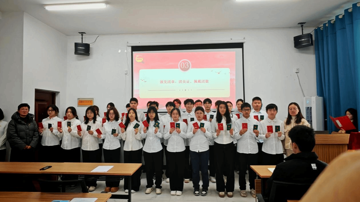 仪式在庄严的国歌声中拉开帷幕,全场人员起立肃立,高唱国歌,爱国情怀与责任担当在歌声中传递。随后,现场宣读2025年下半年新团员名单,臧秀娟、揭蕾两位老师为新团员依次颁发团章、团员证,并亲手为他们佩戴团徽。