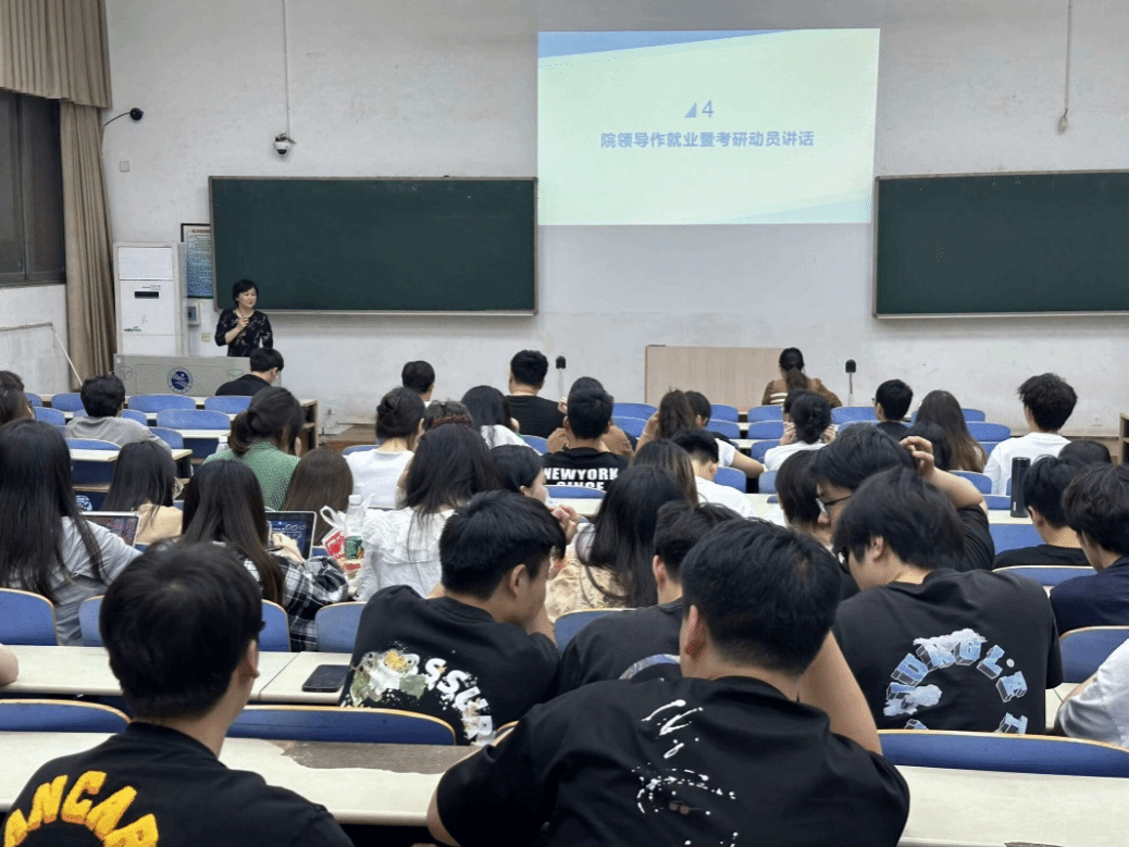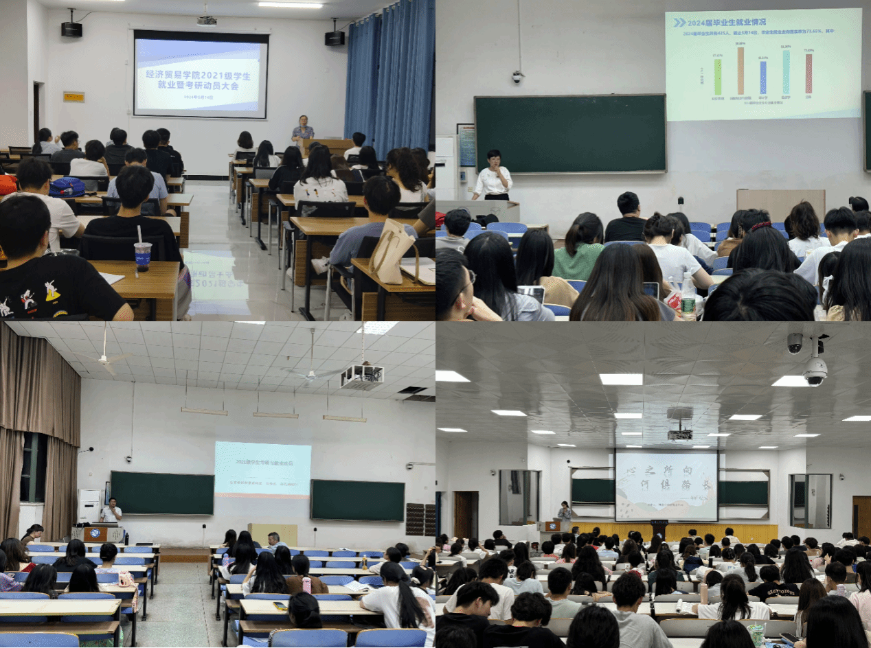 会上,学院辅导员们介绍了经济贸易学院2020-2024届毕业生考研、考公及就业情况,并对2024年征兵政策进行了宣传;各教研室主任和专业负责人从当前就业市场的趋势和就业政策出发,为同学们提供实用的求职技巧和职业规划建议。接着,由四位成功上岸的学长学姐进行分享,他们分别从各自考研、考公、留学成功的经历出发,为在场的同学们传授经验,提供了多角度的思考和启发。